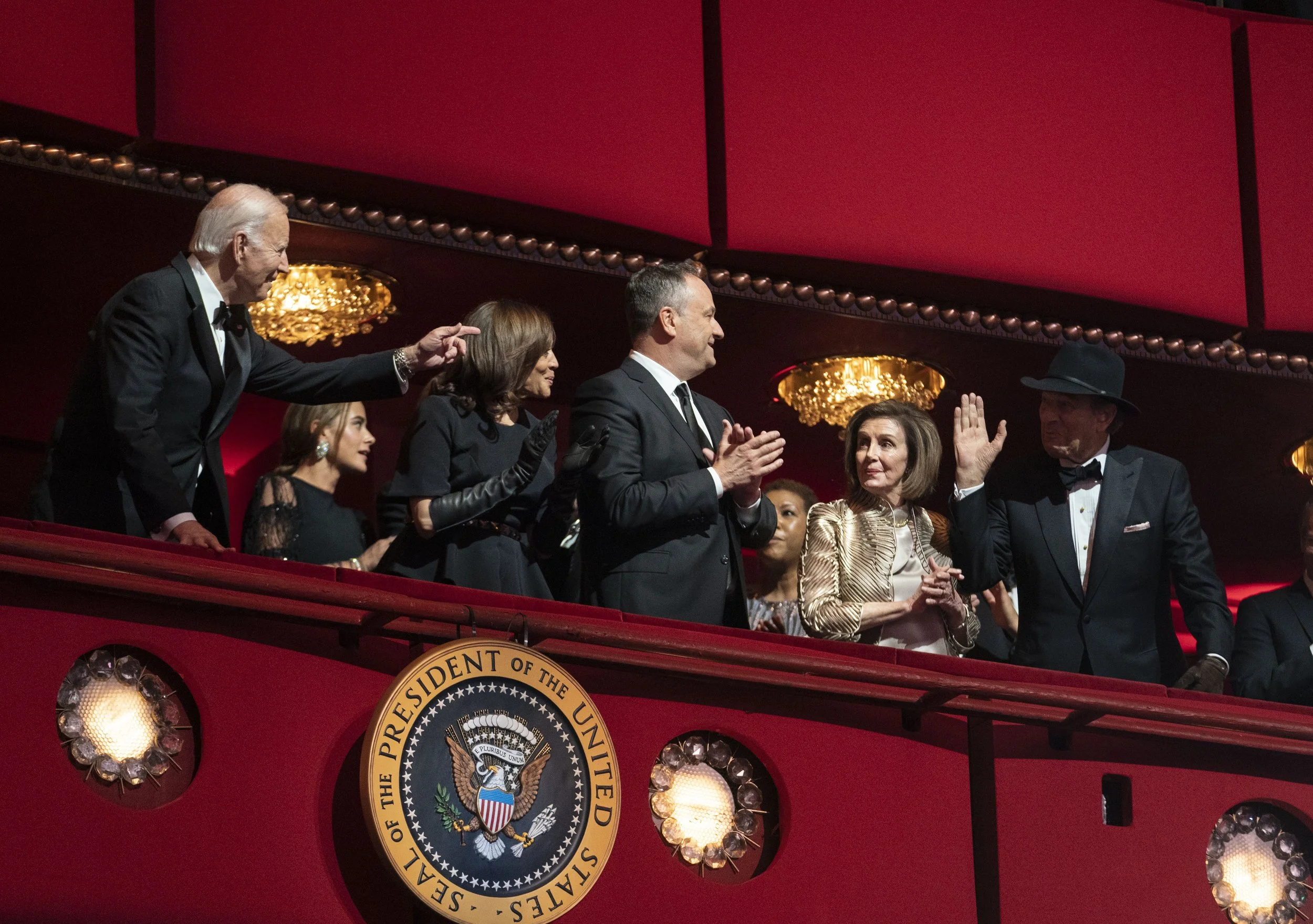 Paul Pelosi wears a hat and glove to cover his injuries from a home invasion by a far-right conspriacy during his first public appearance since the attack at the Kennedy Center Honors in Washington.